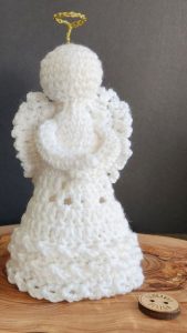 This angel is mostly crocheted in one piece, starting at the top of the head, continuing down through the body, and ending with a softly flared skirt. After that, the wings, arm, and halo are made separately and sewn in place.