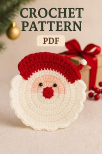 This Santa Coaster is worked in the round, beginning with Santa’s face and beard, and then building upward to shape his iconic red hat. The pattern uses basic stitches—double crochet, half double, single crochet, and simple increases—making it extremely accessible for beginners who want to practice shaping and color changes. Because the coaster is small and works up quickly, it’s also a wonderful project for more experienced crocheters looking for something relaxing and festive.